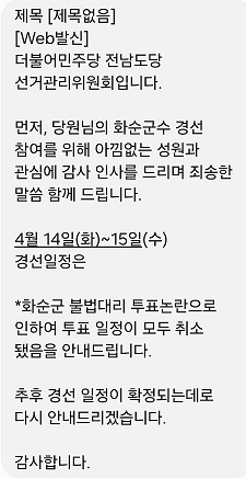 ´õºÒ¾î¹ÎÁÖ´ç Àü³²µµ´ç ¼±°Å°ü¸®À§¿øÈ¸´Â ´ë¸®ÅõÇ¥ ³í¶õÀÌ È®»êµÇÀÚ ´ç¿øµé¿¡°Ô ¹®ÀÚ¸¦ º¸³» ¡®14~15ÀÏ·Î ¿¹Á¤µÆ´ø °æ¼± ÀÏÁ¤Àº ºÒ¹ý ´ë¸®ÅõÇ¥ ³í¶õÀ¸·Î ÀÎÇØ ¸ðµÎ Ãë¼ÒÇÑ´Ù¡¯¸ç ¡®ÃßÈÄ ÀÏÁ¤ÀÌ È®Á¤µÇ´Â ´ë·Î Àç°øÁöÇϰڴ١¯°í ¹àÇû´Ù.